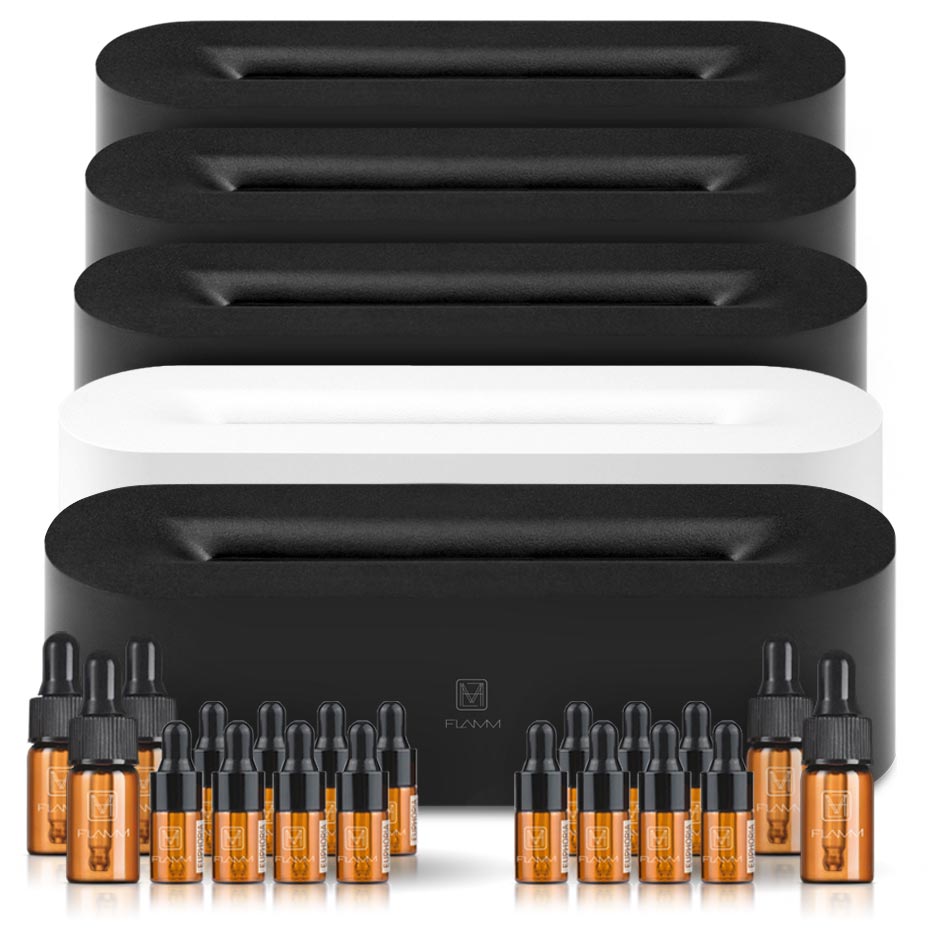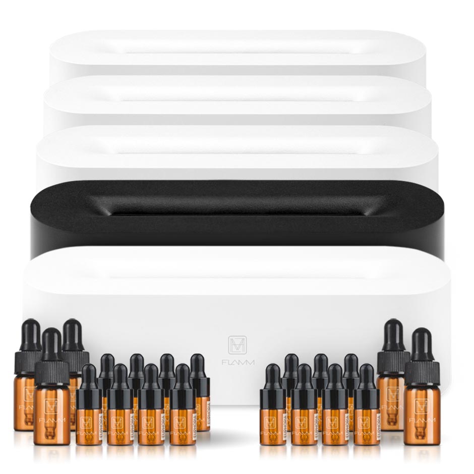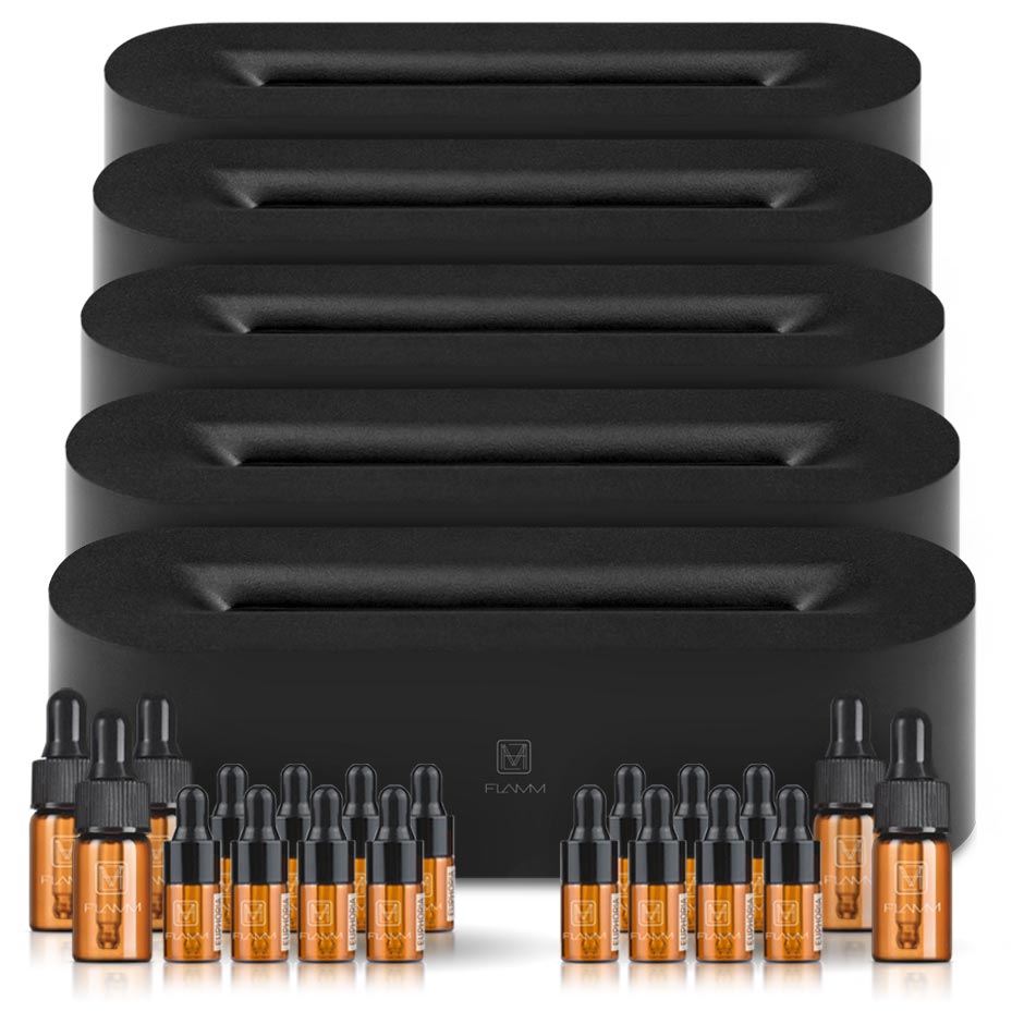 5x FLAMM Home eszköz (választott színekben) + 5x 10ml FLAMM illóolaj (azonos kiválasztott illattal) + 5x AJÁNDÉK FLAMM illóolaj csomag (3x3ml) : Euphoria, Mistique, Sparkle